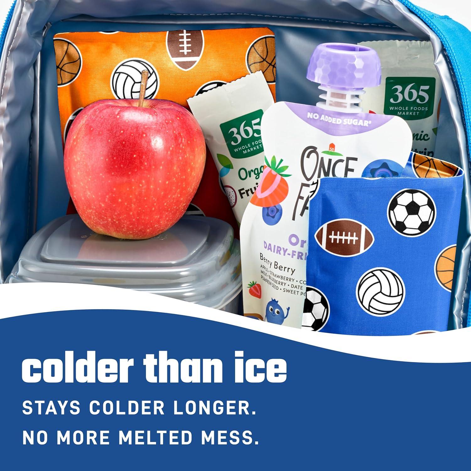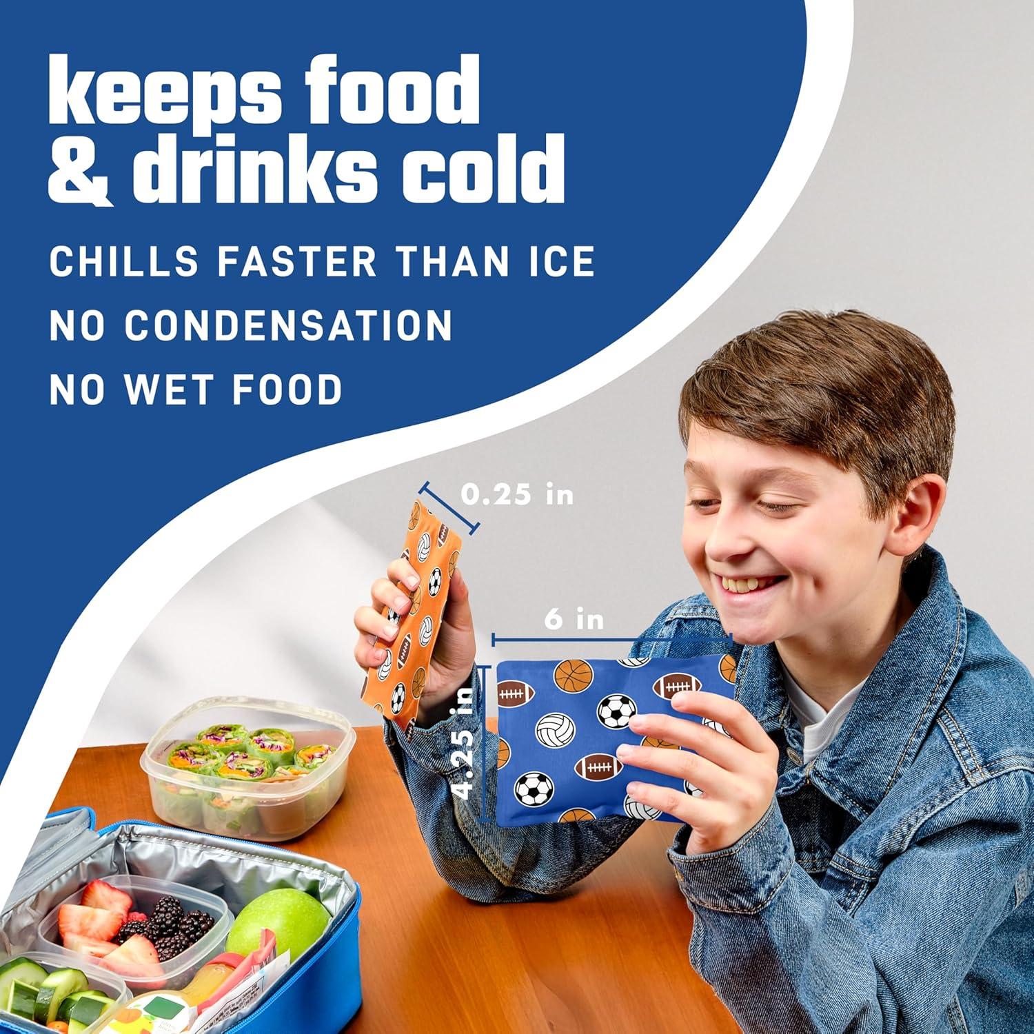 FEATURES – Includes 2 flexible soft lunch ice packs each measuring 6.5″x 4.25″x 0.5”. Top-quality, stretchy nylon and eco-friendly gel, these reusable ice packs for lunch boxes stay flexible when frozen for insulation to bottles, food and beverages.