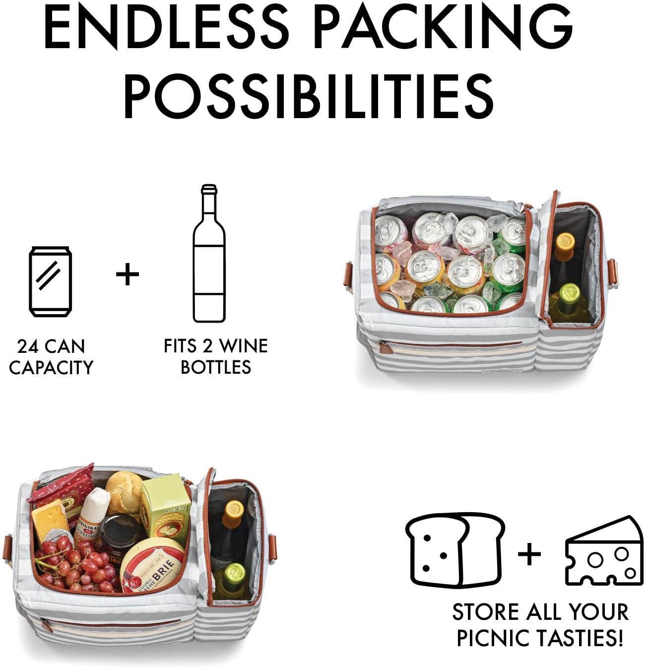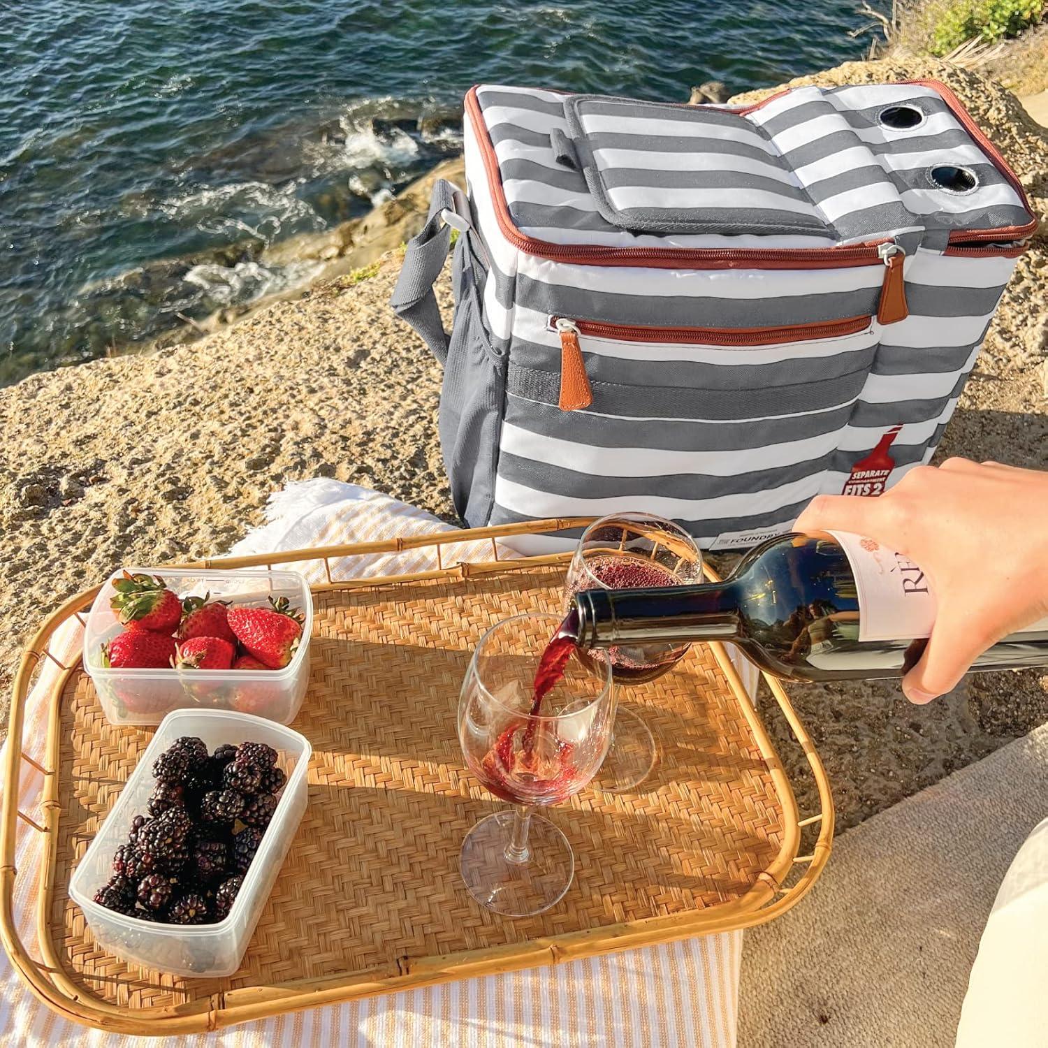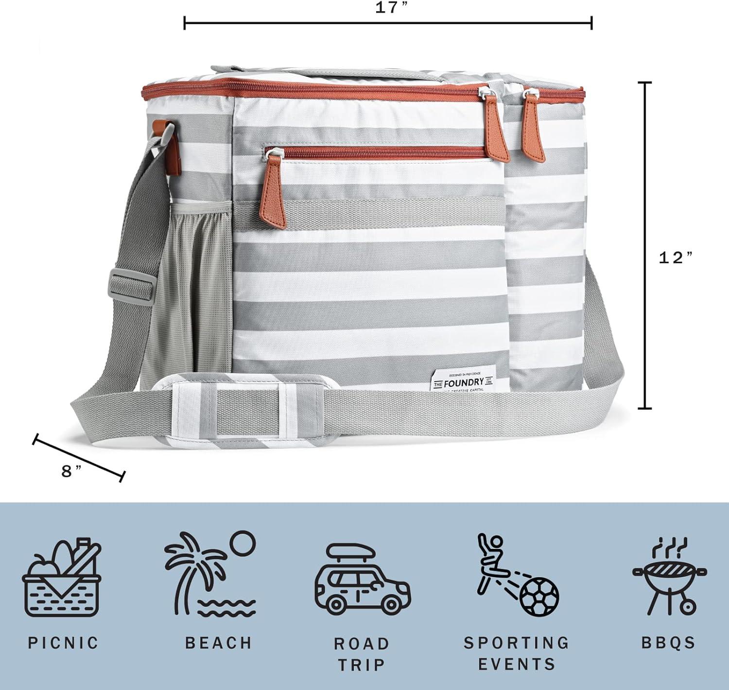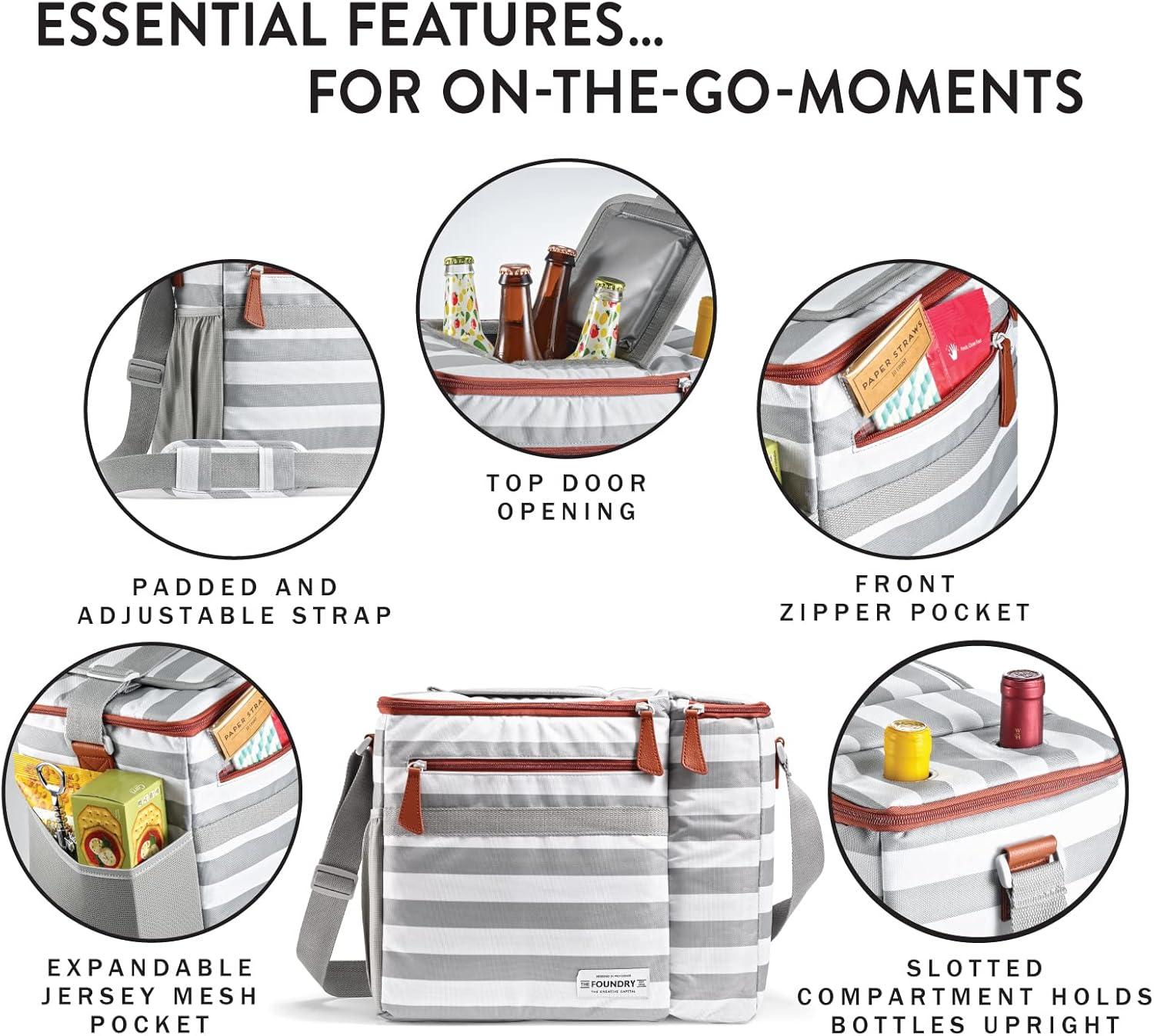 Fit & Fresh Foundry Soft Cooler Bag Insulated Leak Proof and Wine Carrier Bag, 24 Can Large Soft Sided Cooler Bag for Men and Women, 2 Bottle Wine Holder Tote Bag for Travel, Beach and Picnic Bag(Grey Stripe)