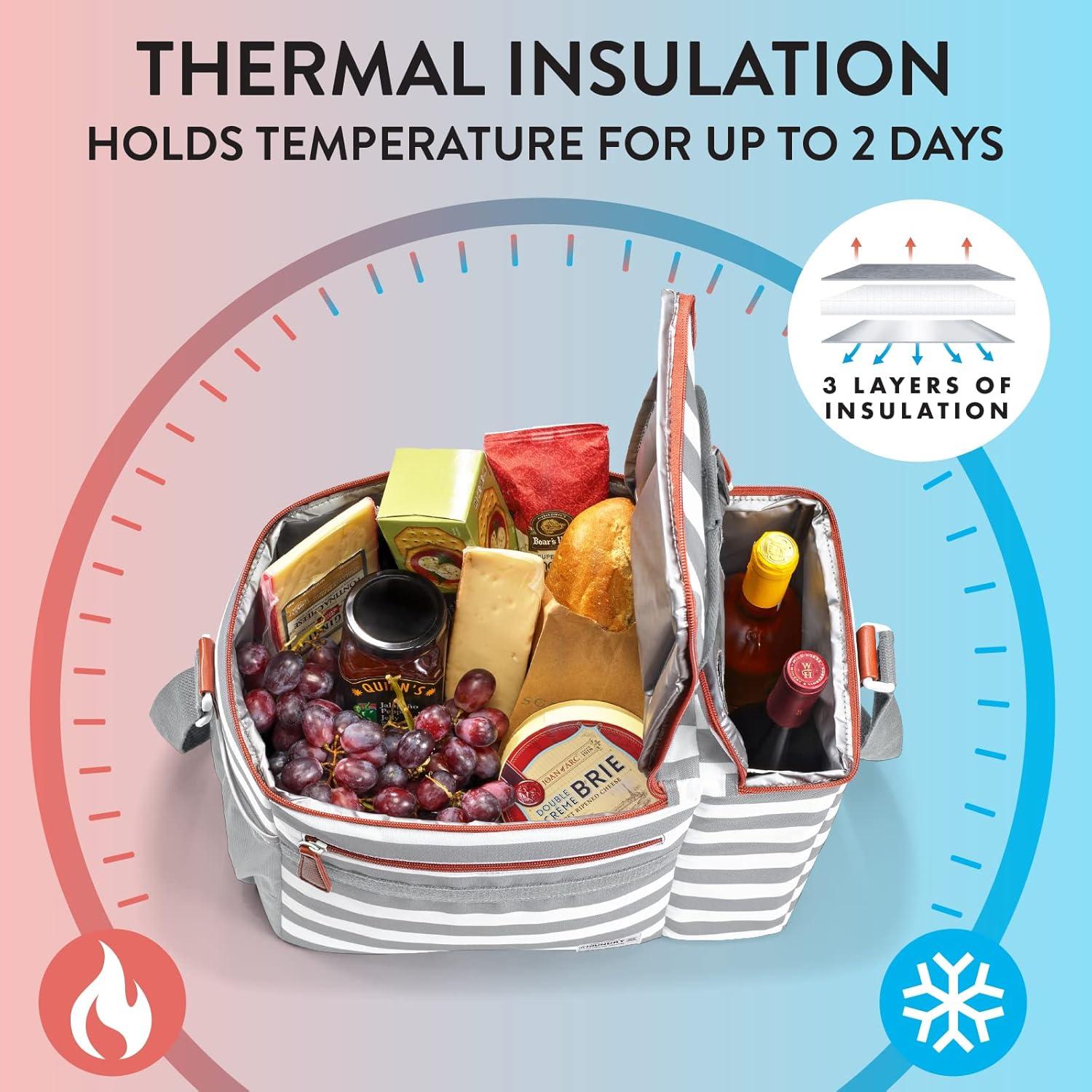 STAYS COOL – 3 layer thermal insulation ensures prolonged freshness, complemented by a leak-proof interior for easy cleaning. Our slotted compartment holds wine bottles upright when traveling.