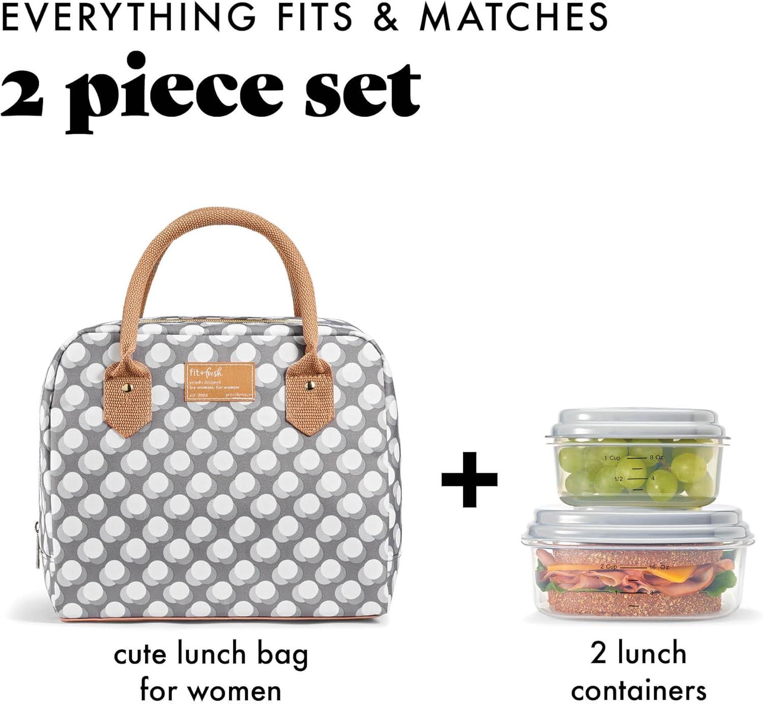 Fit & Fresh Lunch Bag For Women, Insulated Womens Lunch Bag For Work, Leakproof & Stain-Resistant Large Lunch Box For Women With 2 Large Containers, Zipper Closure Bloomington Lunch Bag, Plum Stripe(Grey Dot)