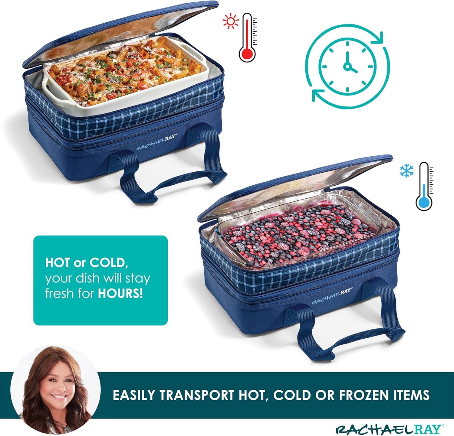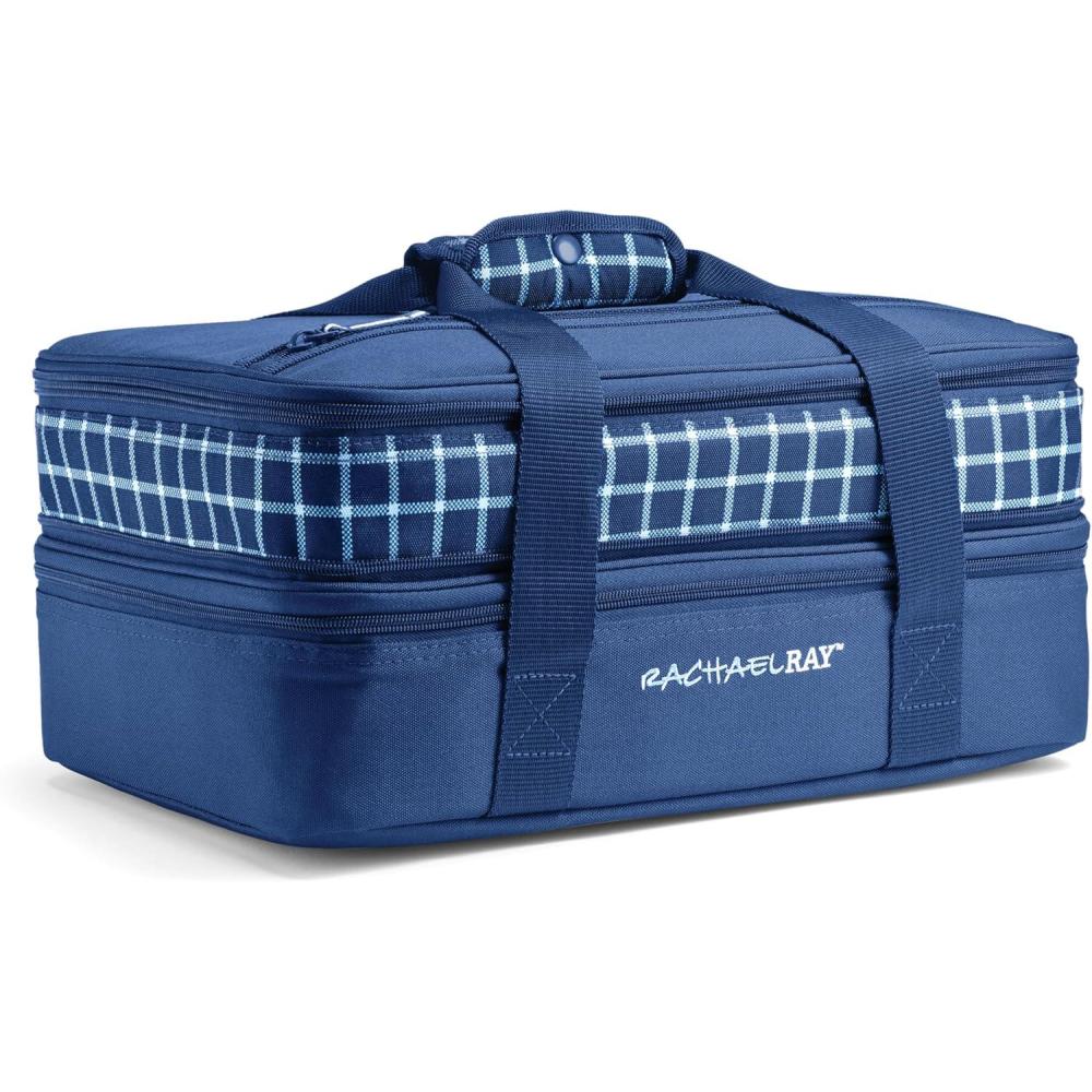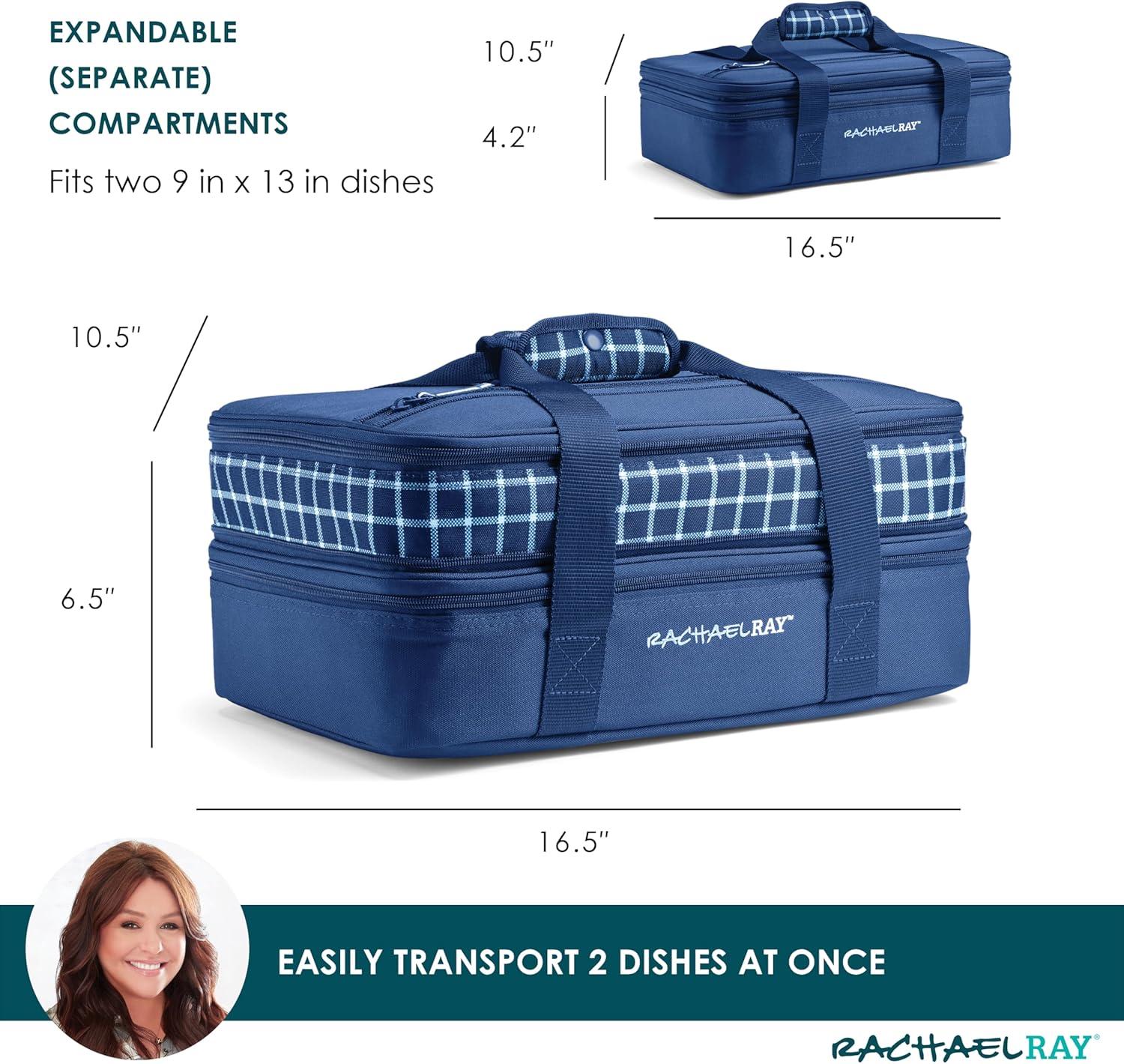 Rachael Ray Expandable Insulated Casserole Carrier for Hot or Cold Food, Thermal Lasagna Lugger Tote for Potluck, Parties, Picnic, and Cookouts, Fits 9″ x 13″ Baking Dish(Blue Gingham)